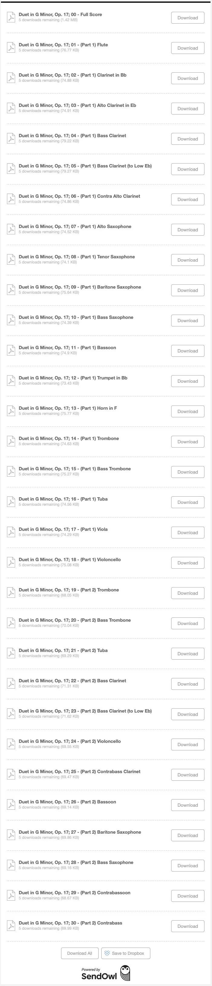You can download everything (‘Download All’ button at the bottom), save the files to Dropbox, or download selected score/parts individually.