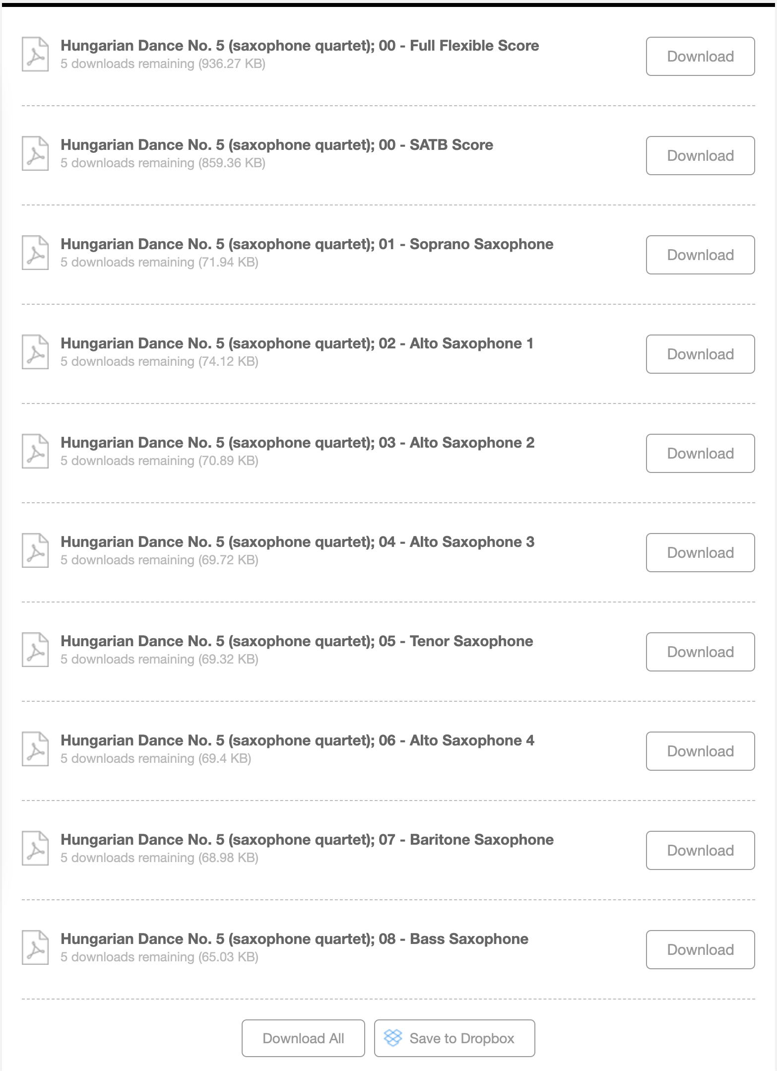 You can download everything (‘Download All’ button at the bottom), save the files to Dropbox, or download selected score/parts individually.