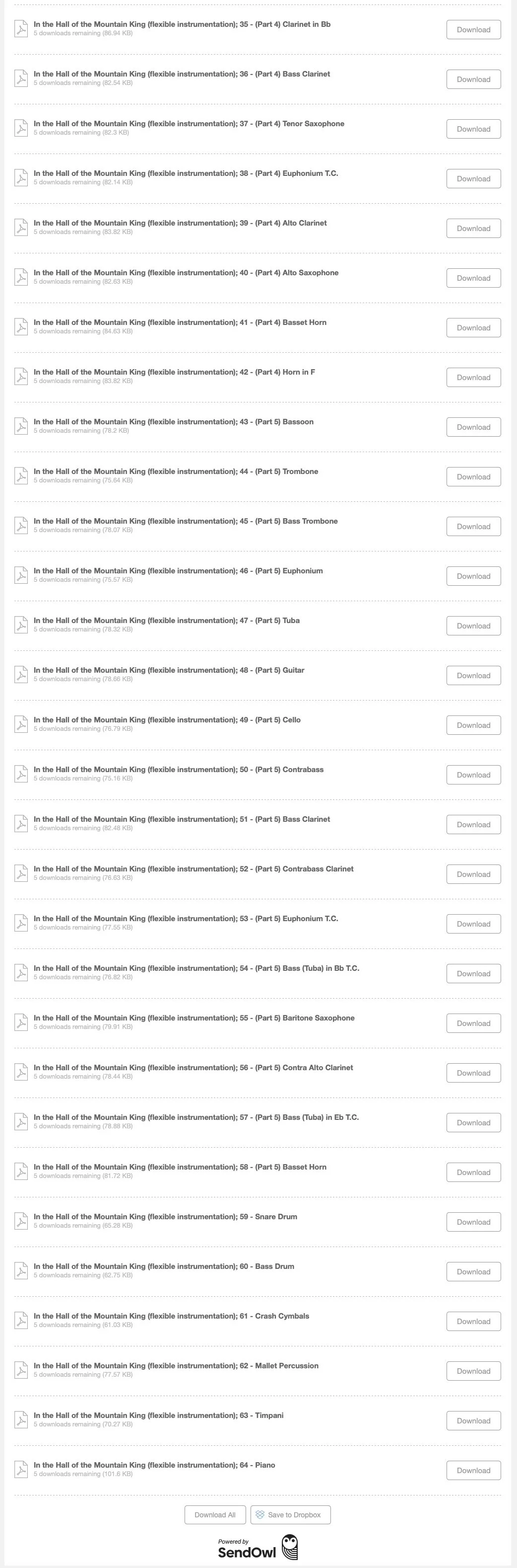You can download everything (‘Download All’ button at the bottom), save the files to Dropbox, or download selected score/parts individually.