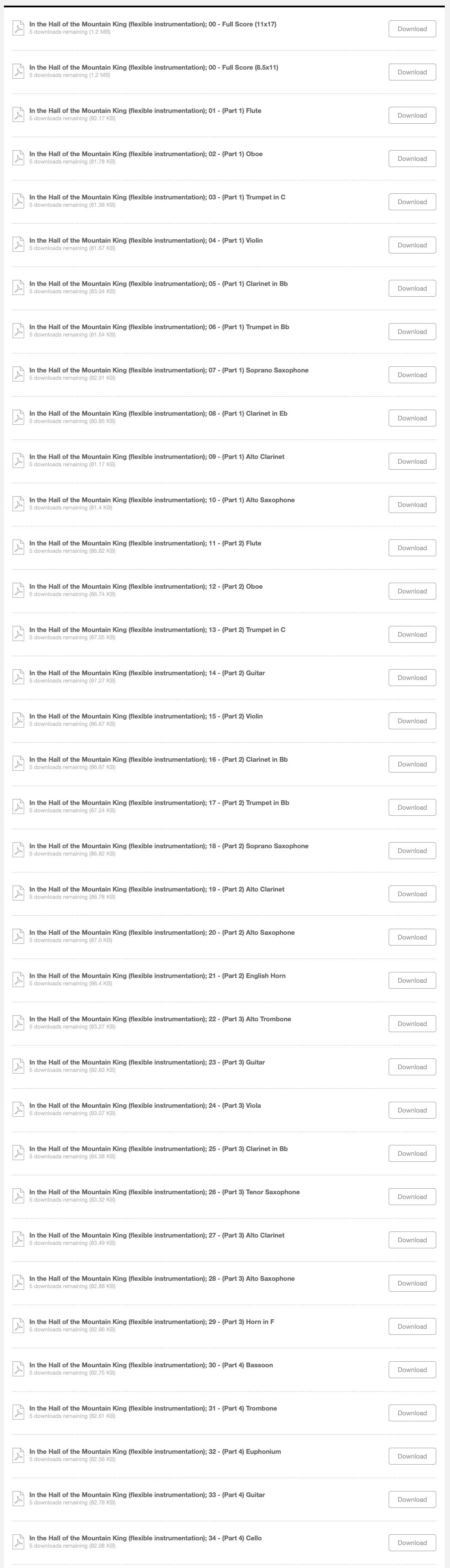 All individual parts are available as separate PDF files, along with the full score (when purchased directly from iandeterling.com). To make locating individual parts easier, each instrument in the list is assigned a unique index number. This number corresponds to the numbered PDF file. For example, if you want Alto Saxophone (Part 4), find it in the instrument list and note its index number (e.g., 39). Then, locate the PDF file that has that number - files are organized in numerical order, so you can quickly access the correct part without searching through each file individually .