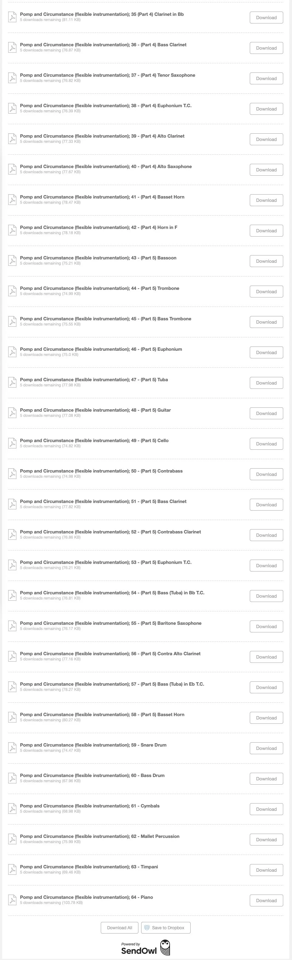 You can download everything (‘Download All’ button at the bottom), save the files to Dropbox, or download selected score/parts individually.